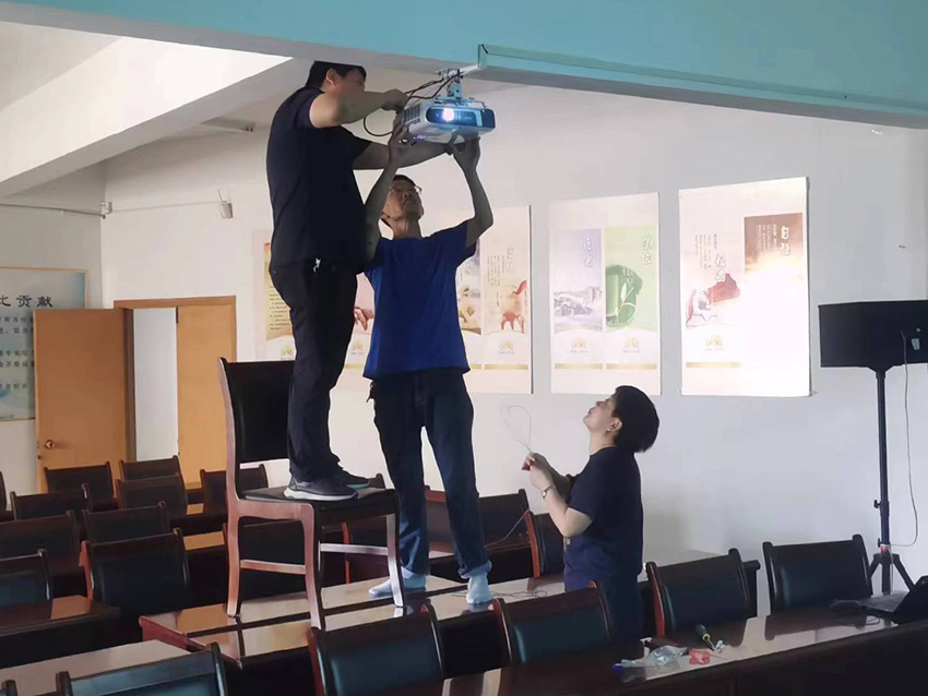 7月11日,李楊猛和譚國紅兩位同志協(xié)助信息部一起動手安裝、調試新購投影儀。